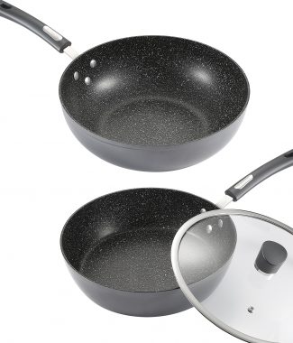 Monfish Deep Frying & Wok Pan Set 12 inch wok & stir fry pan w lid,11 inch skillet frying pan w lid Non Stick Granite Stone Finish